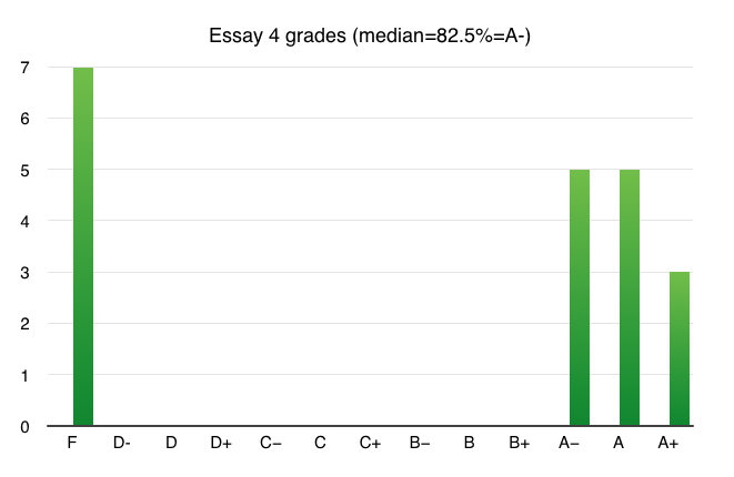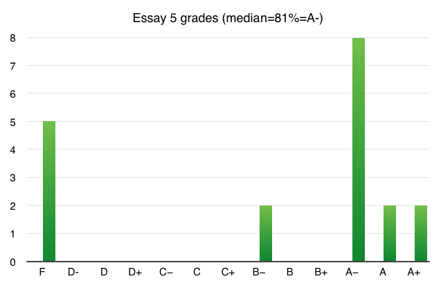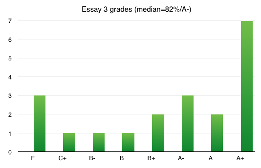 - Dec.08: Essay 3 is now graded. This is the Essay 3 grade distribution. Essay 3 and Fall Participation grades were just sent out by e-mail individually. Here is the Fall Participation grade distribution. Overall, for the running weighted grades, everyone is on track to pass the course, with scores between 54-95% and a median of 81%.
