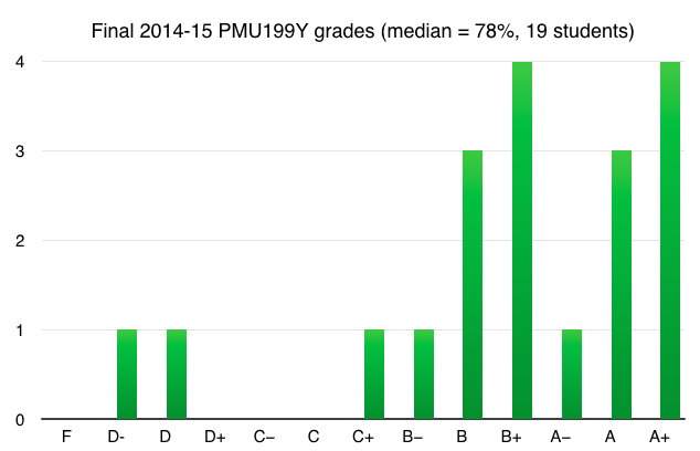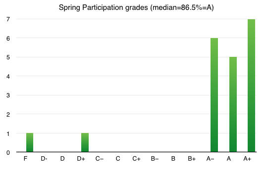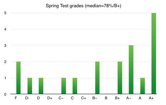 - Apr.12: Final grades have been computed and submitted online (after they are approved, they should show up in ROSI). Congratulations: everyone passed! 40% of the class got As, 40% got Bs, and 20% got Cs or Ds.