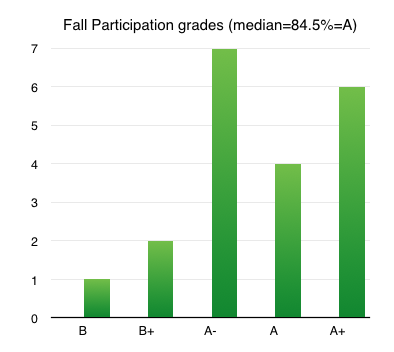 - Everyone is on track to get a good grade for Fall Participation: assuming you all turn up to class on Nov.26, yours will range between 73%-95% (i.e., B+ to A+), with a median of 84.5% (A-/A). Fall Participation is also worth 10% of your Final Grade.